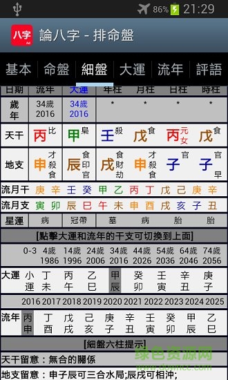 4.重新排列細(xì)盤,使得更加實(shí)用,大運(yùn)和流年互相關(guān)聯(lián),點(diǎn)擊大運(yùn)流年可以互動(dòng);