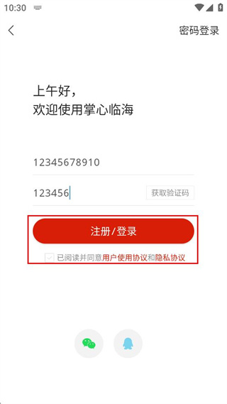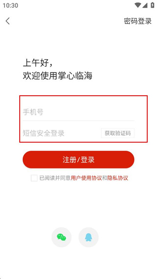 3、在密碼登錄界面輸入手機號和驗證碼。