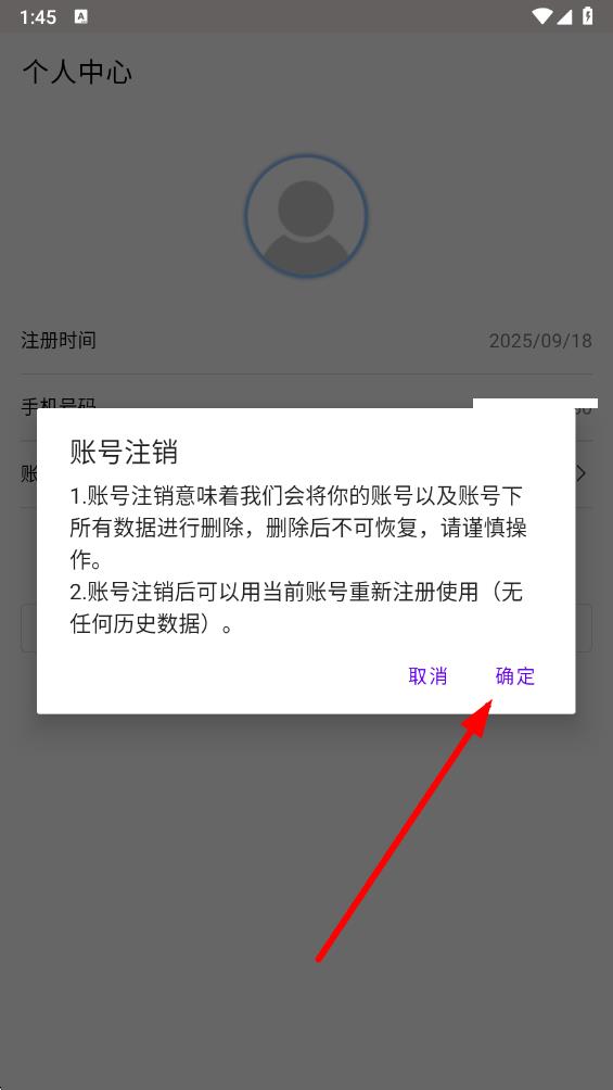 4、在彈出的賬號(hào)注銷提示框中,點(diǎn)擊確定,即可完成賬號(hào)注銷操作。