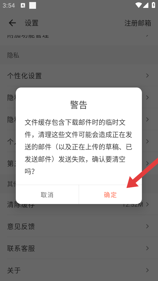 4、在警告的確認框中,需要點擊紅色確定的按鈕,完成緩存清除。