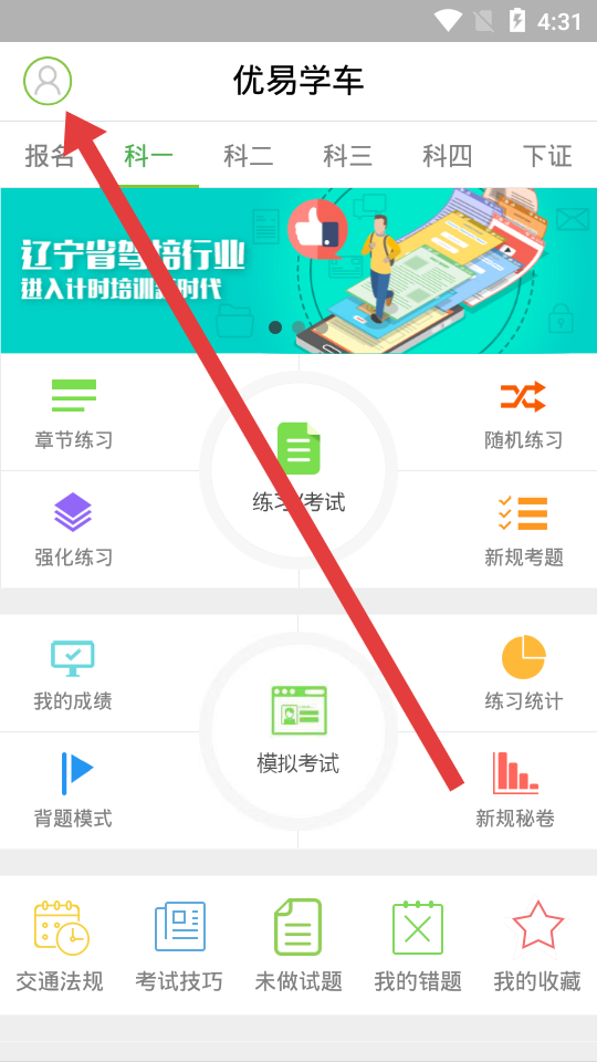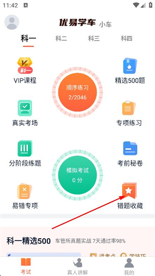 1、打開(kāi)優(yōu)易學(xué)車APP,點(diǎn)擊上方錯(cuò)題收藏選項(xiàng)。