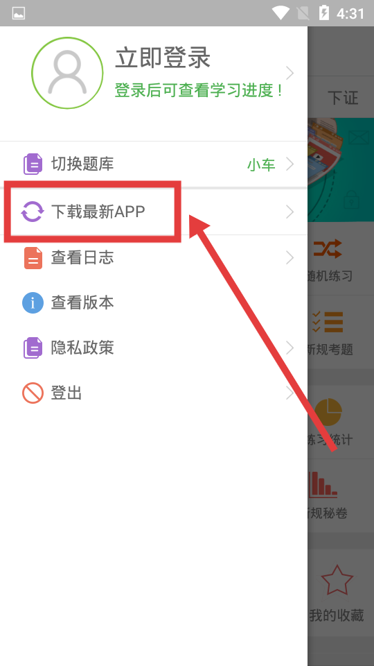 2、成功打開(kāi)側(cè)邊菜單欄后,在顯示的各項(xiàng)功能選項(xiàng)中,仔細(xì)查找?guī)в邢螺d最新APP字樣的選項(xiàng),找到后直接點(diǎn)擊該選項(xiàng)進(jìn)入下一步操作。
