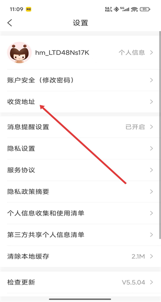 2、在設(shè)置頁面點(diǎn)擊“收貨地址”,進(jìn)入收貨地址頁面。