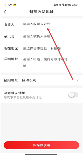 4、在新建收貨地址頁面依次輸入收貨人姓名、手機(jī)號、所在地區(qū)、詳細(xì)地址等信息,點(diǎn)擊“保存并使用”,完成收貨地址添加流程。