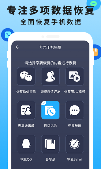 1.支持手機(jī)照片恢復(fù)、wx和QQ聊天恢復(fù)、文檔、視頻、語(yǔ)音恢復(fù)。