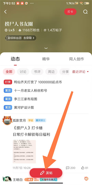 3、在書友圈頁面,點(diǎn)擊發(fā)帖按鈕,即可進(jìn)入發(fā)帖編輯界面即可。