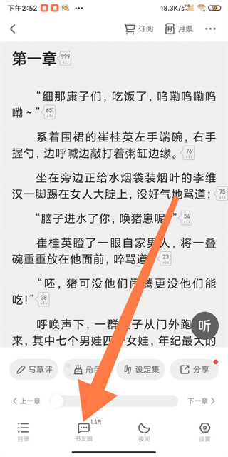 2、在小說閱讀界面,點(diǎn)擊下方書友圈選項(xiàng),進(jìn)入書友圈頁面。