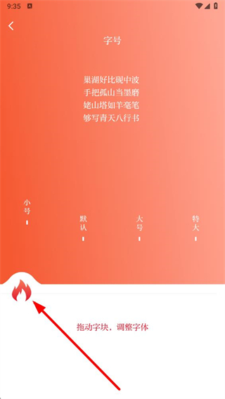 4、在字號設(shè)置頁面,拖動字塊可在小號、默認、大號、特大之間調(diào)整字體大小。