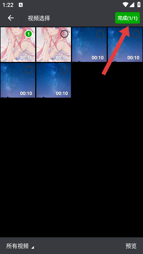 2、在視頻選擇界面,勾選要轉(zhuǎn)換的視頻后,點擊右上角完成,進入選擇頁面。
