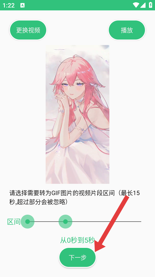 3、在頁面拖動區(qū)間滑塊選擇轉(zhuǎn)為GIF的視頻片段,設(shè)置完成后點擊下一步。