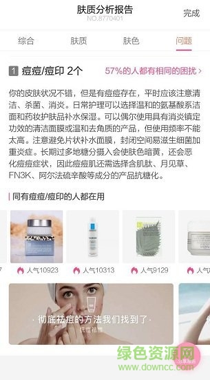 膚質(zhì)報告的內(nèi)容涵蓋膚質(zhì)(分區(qū)域干油性)、皮膚問題(如痘痘)、膚色和膚齡四部分,每一部分都有關(guān)于如何護理和誤區(qū)的知識點科普。在報告的末尾部分,美圖美妝會根據(jù)用戶的皮膚問題推薦相應(yīng)適合的產(chǎn)品。