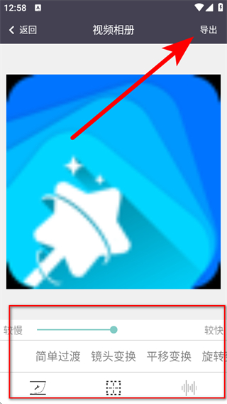 4、在視頻相冊編輯頁面,可調(diào)整播放速度、選擇過渡效果等,編輯完成后點擊右上角導出按鈕,即可生成視頻相冊類的GIF內(nèi)容。