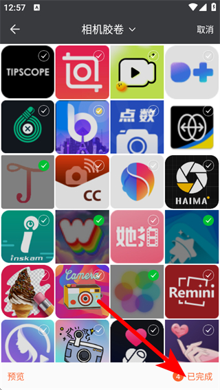 2、在相機膠卷中選擇需要制作的視頻素材,點擊已完成按鈕。