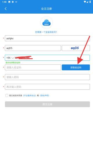 2、在業(yè)主注冊(cè)的界面內(nèi),輸入用戶昵稱、圖形碼以及手機(jī)號(hào),再點(diǎn)擊獲取驗(yàn)證碼的按鈕。
