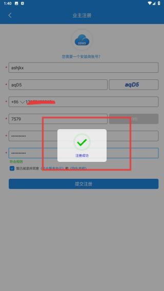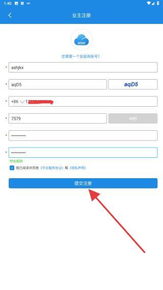3、將收到的驗(yàn)證碼輸入其中,再設(shè)置密碼后,再點(diǎn)擊提交注冊(cè)的按鈕。