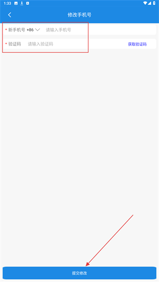 4、輸入新手機(jī)號(hào)、驗(yàn)證碼后,點(diǎn)擊提交修改即可。