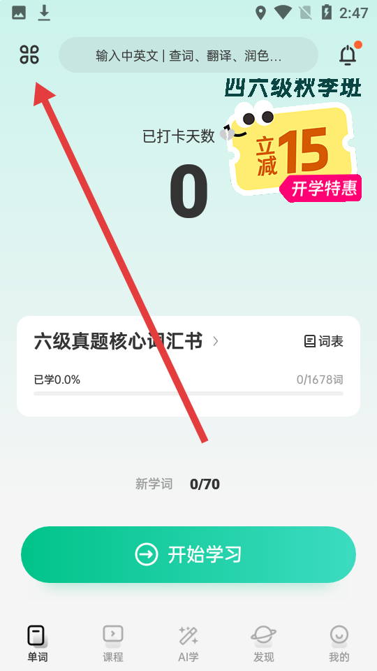 1、打開扇貝煉句APP,點(diǎn)擊左上角由四個(gè)小方塊組成的多功能按鈕。