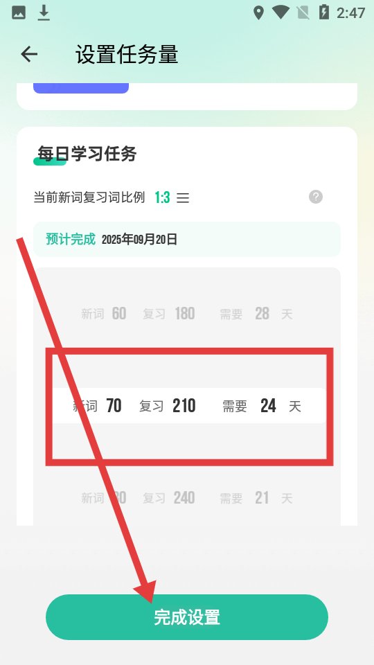 3、進(jìn)入學(xué)習(xí)設(shè)置頁,劃動(dòng)每日學(xué)習(xí)任務(wù)下方的數(shù)字來設(shè)置任務(wù)量,最后點(diǎn)擊完成設(shè)置。