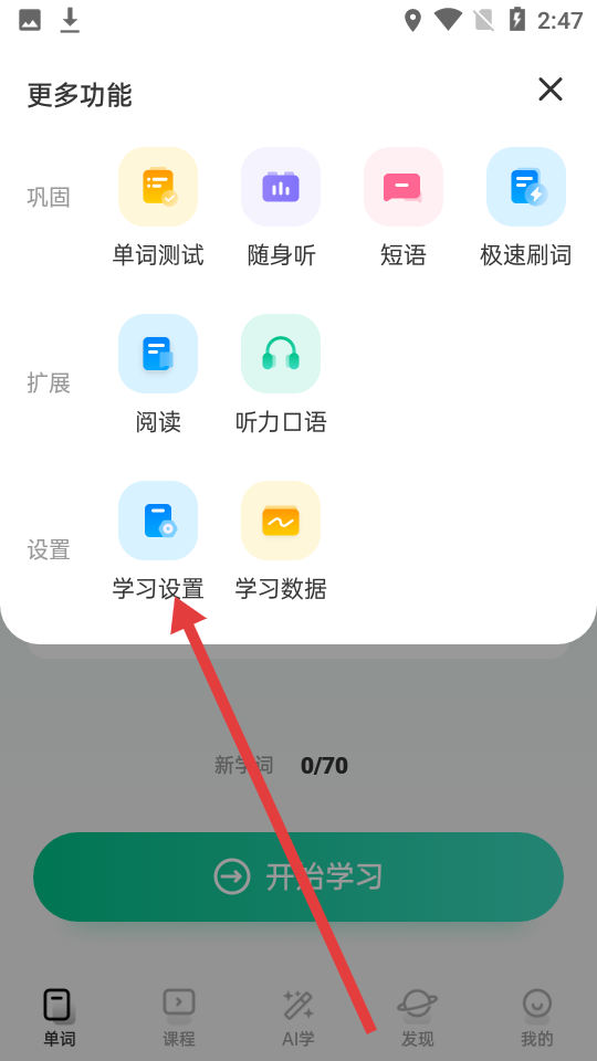 2、在彈出的更多功能界面里,找到并點(diǎn)擊學(xué)習(xí)設(shè)置選項(xiàng)。