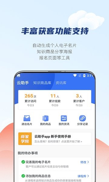 學(xué)河灣云助手app依托智能數(shù)字化平臺(tái)為廣大用戶帶來更加高效的營銷獲客工具,適用范圍廣泛。能夠幫助進(jìn)行多項(xiàng)數(shù)據(jù)信息的管理、統(tǒng)計(jì)、追溯等,專業(yè)安全的營銷工具用起來也更加方便,并支持線上便捷式溝通等,需要就趕緊來下載看看吧!