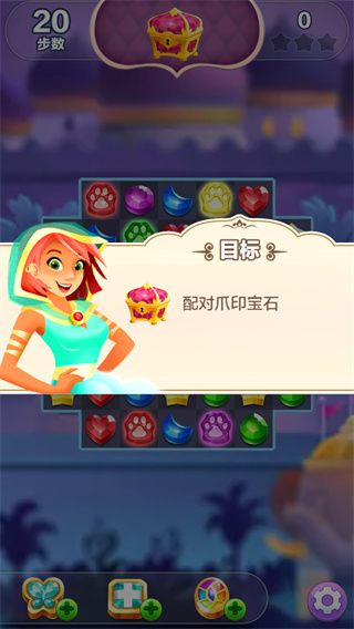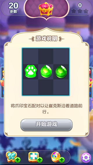 6、隨著步數(shù)的進(jìn)行,消除的爪印寶石越多,崔克斯走得也就越遠(yuǎn),在20步之內(nèi)達(dá)到終點(diǎn)即可過關(guān);