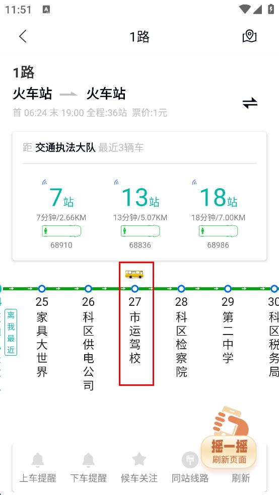 4、點(diǎn)擊后進(jìn)入到“1路”公交的詳情頁面,可查看該線路的站點(diǎn)、首末車時(shí)間、票價(jià)以及公交實(shí)時(shí)位置等信息,方便規(guī)劃出行。