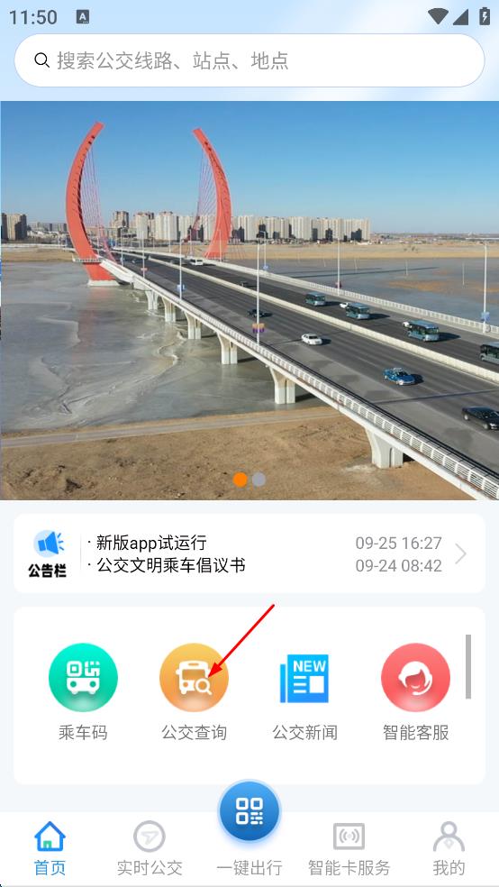 2、在應(yīng)用主界面,點(diǎn)擊“公交查詢”選項(xiàng),進(jìn)入到公交查詢頁面。
