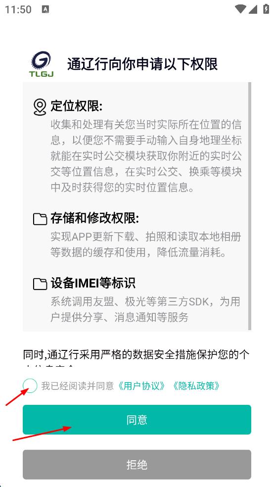 1、打開通遼行應(yīng)用,彈出權(quán)限申請?zhí)崾究?,勾選我已經(jīng)閱讀并同意用戶協(xié)議和隱私政策,點(diǎn)擊“同意”,進(jìn)入到應(yīng)用主界面。