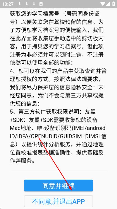 1、打開考拉駕考駕校APP,在彈出的隱私相關提示頁面,點擊同意并繼續(xù),進入APP主界面。