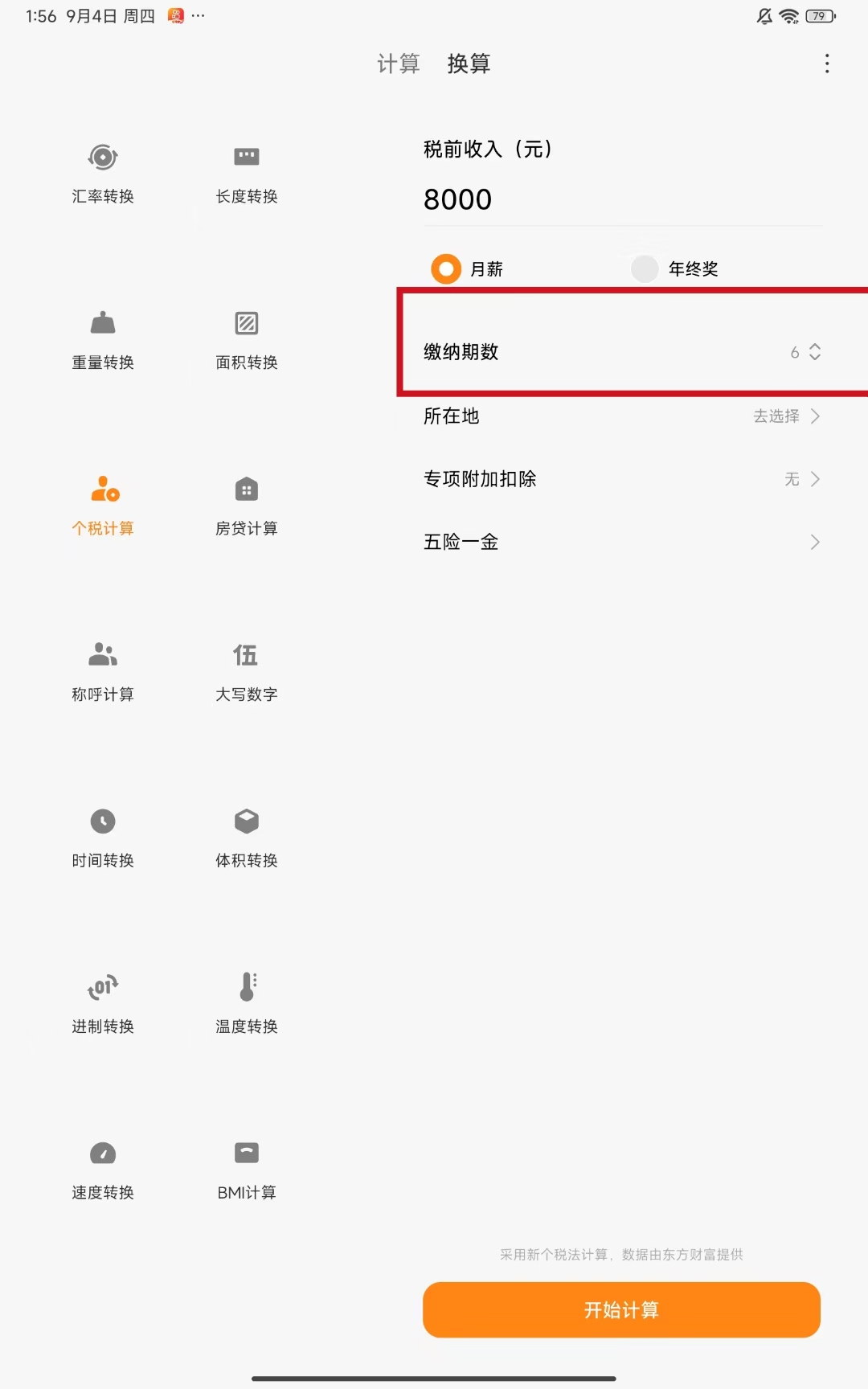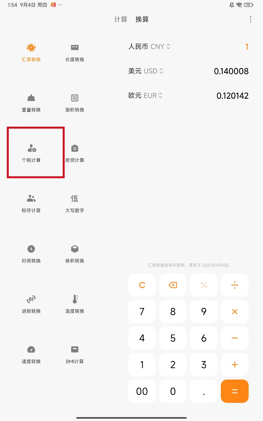 2、在換算功能頁面中,找到并點(diǎn)擊個(gè)稅計(jì)算選項(xiàng),進(jìn)入個(gè)稅計(jì)算界面。