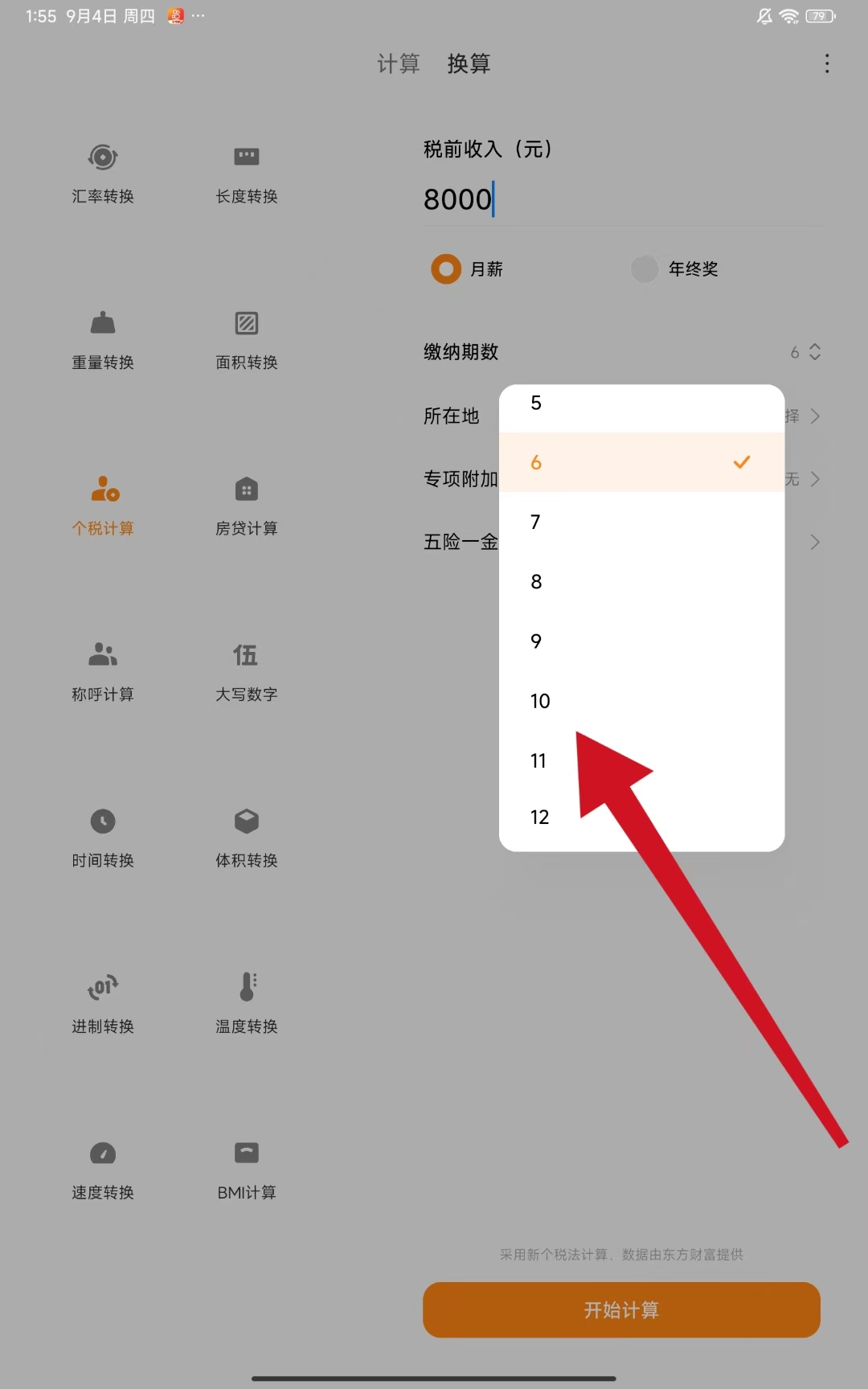 3、在個(gè)稅計(jì)算界面,找到繳納期數(shù)選項(xiàng),點(diǎn)擊其右側(cè)的下拉箭頭,在彈出的期數(shù)列表中選擇想要設(shè)置的期數(shù)即可。