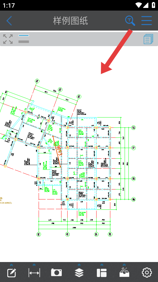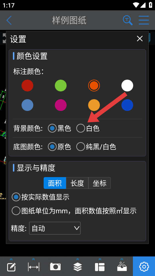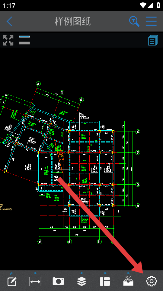 1、打開CAD快速看圖APP,進入圖紙查看頁面,點擊底部工具欄最右側(cè)的設(shè)置圖標,彈出設(shè)置面板。