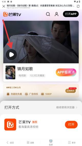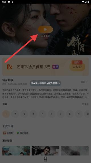 1、通過(guò)搜索/瀏覽找到目標(biāo)影片,進(jìn)入劇集詳情頁(yè),點(diǎn)擊播放觸發(fā)跳轉(zhuǎn)第三方網(wǎng)頁(yè)的提示,過(guò)程無(wú)需操作可自動(dòng)跳轉(zhuǎn)。