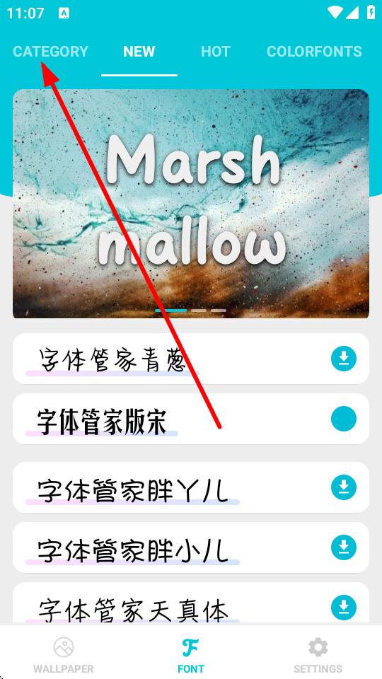 1、在字體應(yīng)用界面,點擊頂部CATEGORY選項,進入字體分類頁面。