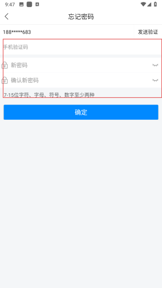 4、按提示輸入手機(jī)驗(yàn)證碼,設(shè)置新密碼后點(diǎn)擊確定即可。