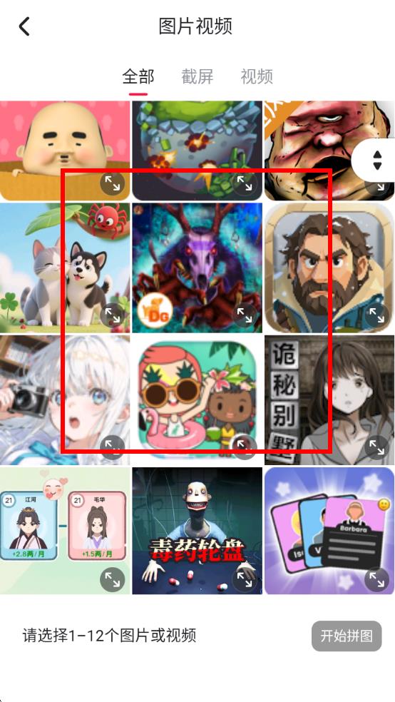 2、在圖片視頻頁,挑選1-12張需拼接的圖片/視頻,選好后點開始拼圖。