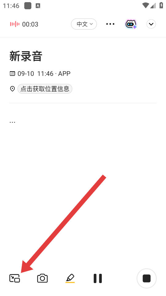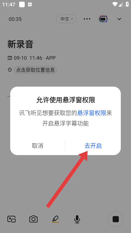 2、在新錄音界面,點擊左下角懸浮字幕相關(guān)圖標(biāo),觸發(fā)懸浮窗權(quán)限請求。