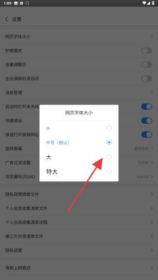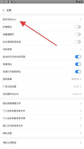 3、進(jìn)入到設(shè)置的頁(yè)面內(nèi),點(diǎn)擊網(wǎng)頁(yè)字體大小的功能按鈕。