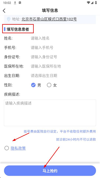 3、在填寫信息頁(yè)面輸入患者信息,勾選隱私政策,點(diǎn)擊馬上搶約完成掛號(hào)。