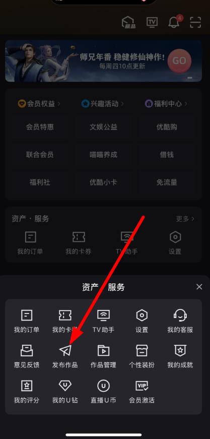 3、在彈出的資產(chǎn)·服務(wù)窗口里,點(diǎn)擊發(fā)布作品選項(xiàng),按照提示完成作品上傳及發(fā)布操作。
