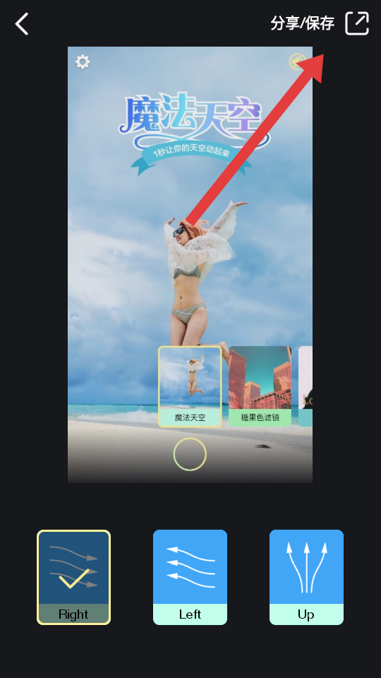 3、照片編輯完成后,點(diǎn)擊右上角分享/保存按鈕,彈出分享與保存選項(xiàng)。