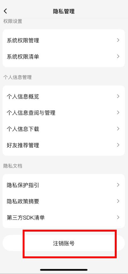 4、在隱私管理頁面下方,點(diǎn)擊注銷賬號(hào),然后按照頁面提示完成賬號(hào)注銷操作。