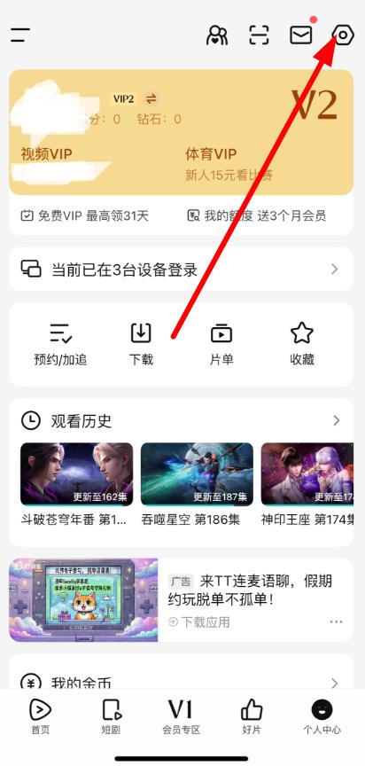 2、在個(gè)人中心頁面,點(diǎn)擊右上角的設(shè)置圖標(biāo)。