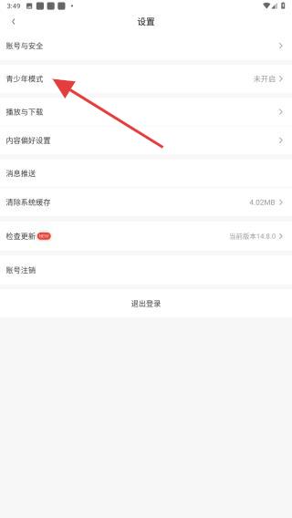 3、進(jìn)入設(shè)置界面后,點擊青少年模式即可跳轉(zhuǎn)至該頁面。