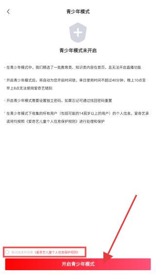 4、進(jìn)入青少年模式頁面,勾選我已閱讀并同意愛奇藝兒童個人信息保護(hù)聲明,然后點擊開啟青少年模式。