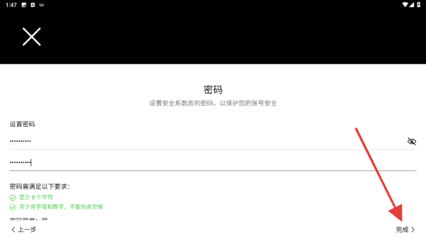 4、進(jìn)入到設(shè)置密碼的頁面內(nèi),輸入兩次相同的密碼后,點擊完成的按鈕即可。