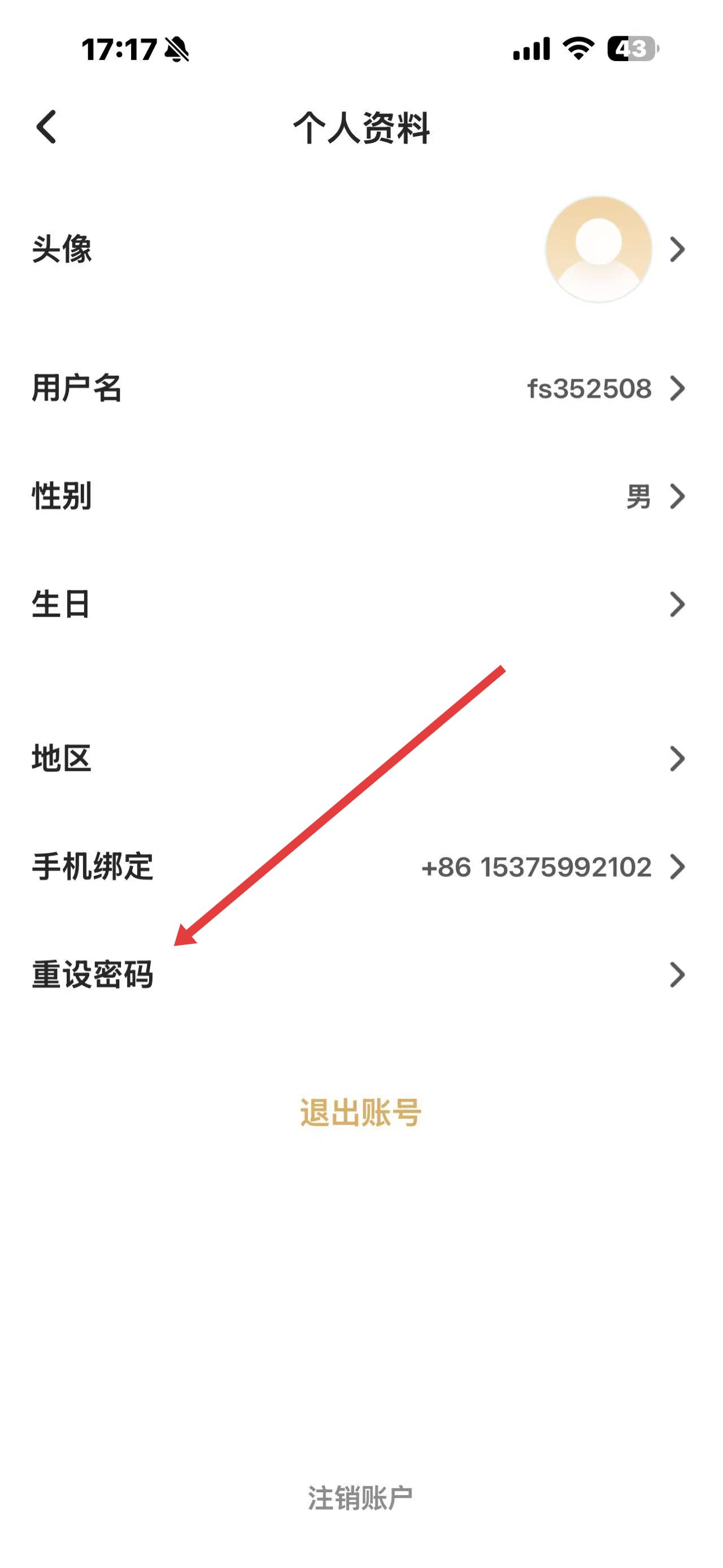 3、在個人資料頁面里,找到并點擊重設密碼選項。
