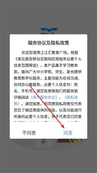 1、打開之江匯APP,在隱私政策彈窗中點擊同意。