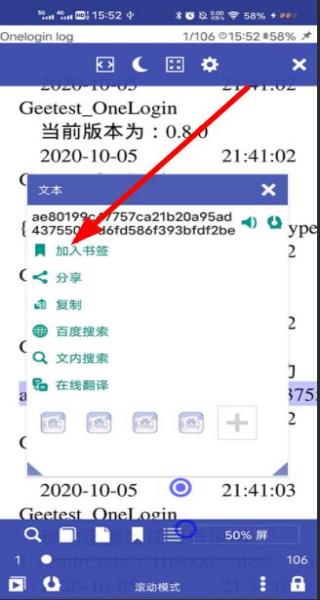 4、在操作列表中,點(diǎn)擊加入書(shū)簽選項(xiàng),完成閱讀模式設(shè)置和書(shū)簽添加操作。