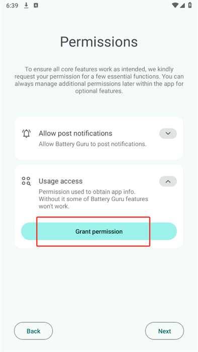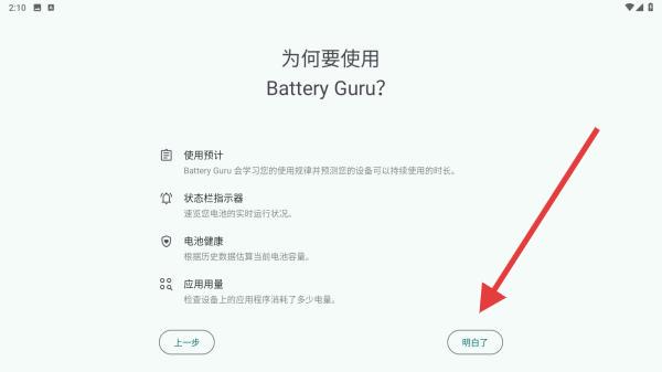 2、展示了為何要使用的教程頁(yè)面,了解預(yù)計(jì)、狀態(tài)欄指示器、電池健康、應(yīng)用用量,點(diǎn)擊明白了進(jìn)入用戶許可界面。